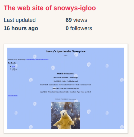 Jan 10 2026 - Added another webpage that will show off all the cool things I like to do! And the button works now! I feel like I the rusty gears in my head are starting to turn with html stuff! So more cool stuff to follow! :D